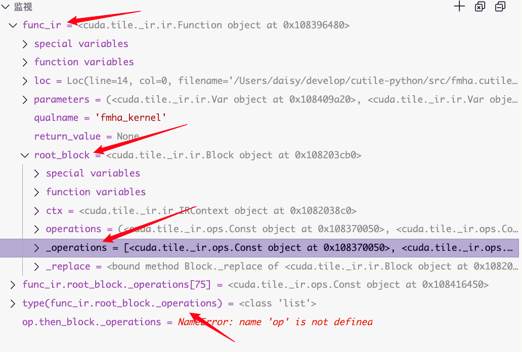 可以看到func_ir.root_block._operations 里面就是我们代码经过最基本的翻译,并经过shape检查之后形成的中间表示。这里infer_types_pass这个pass已经执行完了,所以我们应当可以看到所有的tile的shape都是什么。此处(断点处)调用 func_ir.to_string() 即可将中间表示输出为文本形式。
